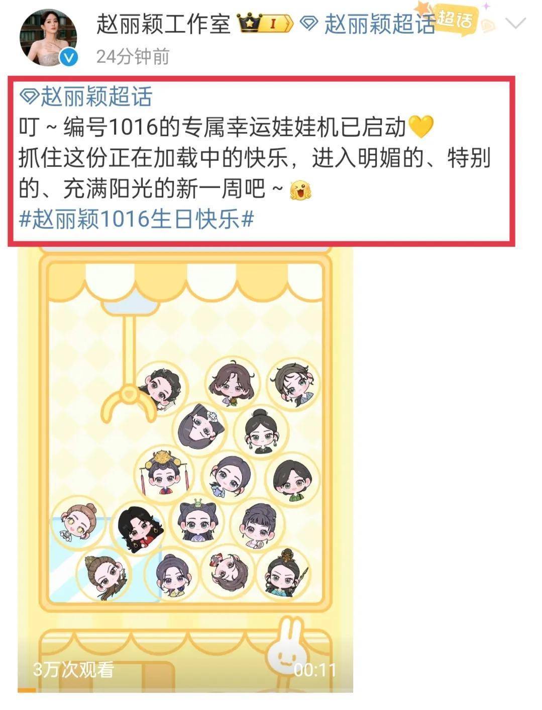 叮叮叮,赵丽颖工作室周一营业正以180迈速度朝我们奔来!10月13日,赵丽颖工作室发博:“叮,编号1016的专属幸运娃娃机已启动!抓住这份正在加载中的快乐,进入明媚的、特别的、充满阳光的新一周吧!”