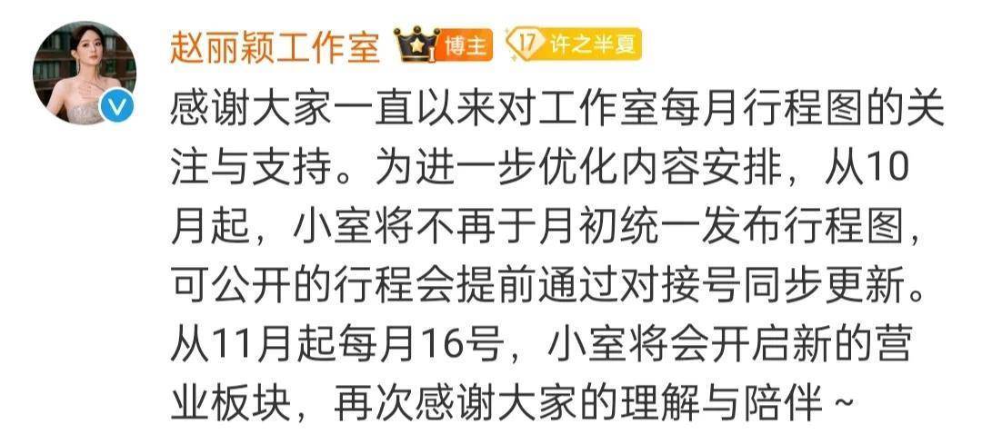 赵丽颖工作室说到做到!像之前丽室就在评论区做出改动和承诺:“感谢大家一直以来对工作室每月行程图的关注与支持。