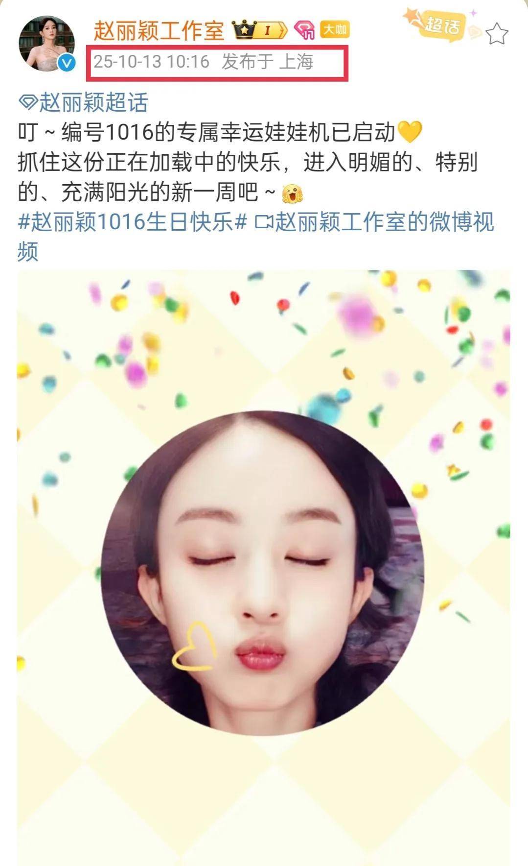 赵丽颖工作室IP地址变化,还有一个可能那就是专门来上海庆生的!毕竟颖宝1016生日快到了,而且颖宝这几个月休假丽室手上也没有多余素材!